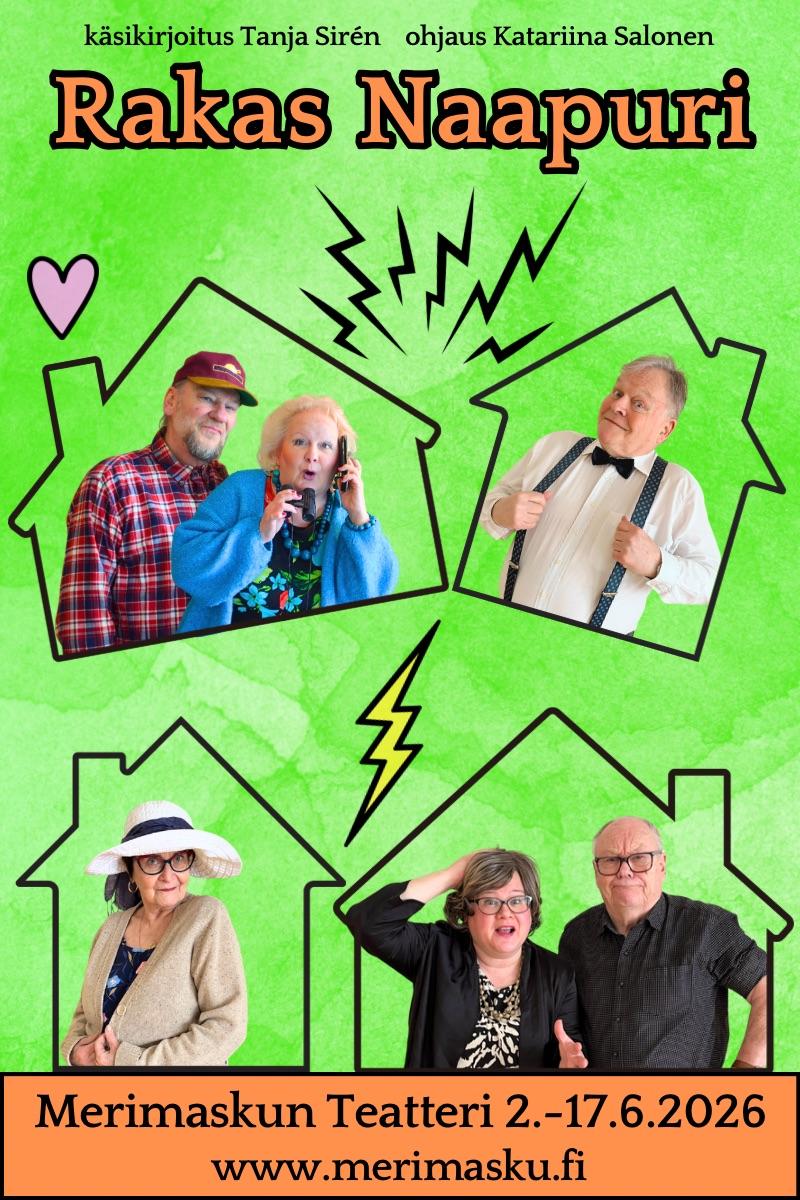 Kesällä 2026 Merimaskun Teatteri esittää komedian Rakas Naapuri. Kuulet pian lisää, mutta sitä ennen laitathan kalenteriisi muistiin kesän esityspäivät!